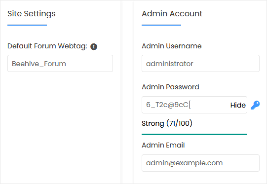 - Admin Username: Your new Beehive username (for security reasons, do not use the administrator or the admin username).