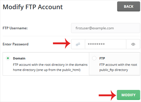To change the main root FTP account, you have to change the password of your DirectAdmin account. However, if you need to change the password of a specific FTP account, follow this instruction.